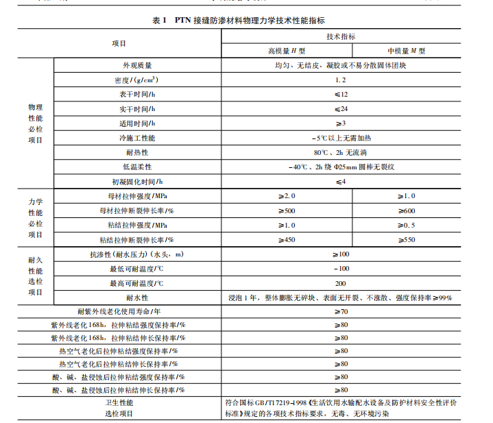 善混凝土性能,提高致密與防水性能。PTN 接縫防滲材料物理力學(xué)技術(shù)性能指標(biāo)見表 1[10-12]